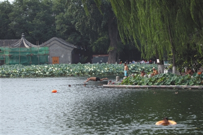8月25日,什刹海,不少市民游到湖心岛上休息然后折返回岸边。新京报记者 王飞 摄
