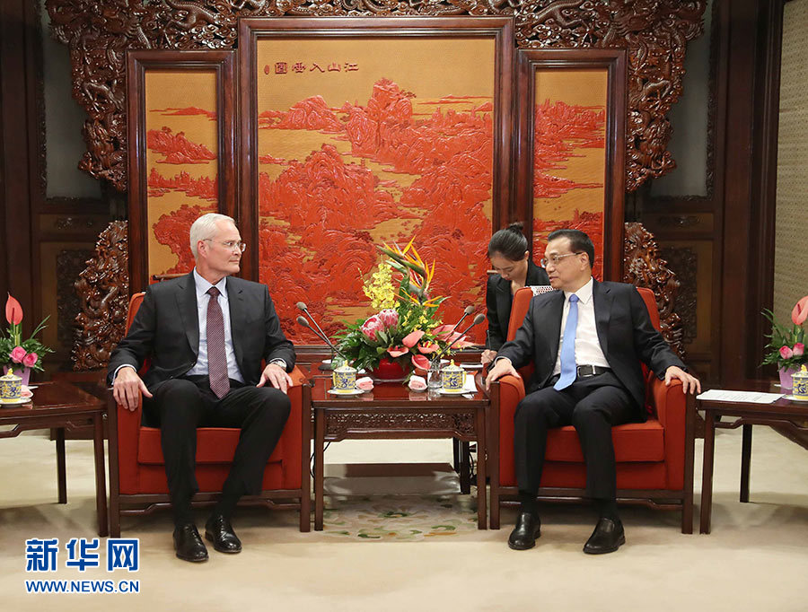 9月7日,国务院总理李克强在北京中南海紫光阁会见美国埃克森美孚公司董事长兼首席执行官伍德伦。 新华社记者 刘卫兵 摄