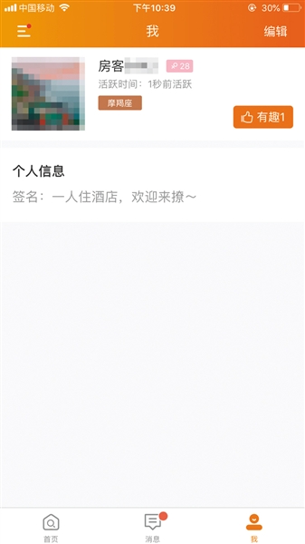 “趣住”APP口号:“相遇在酒店”,昨日,记者体验发现,注册后用户个人签名则被自动填写为:“一人住酒店,欢迎来撩”。