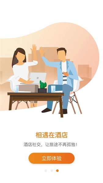 新京报记者发现,在一款名为“趣住”APP的打开页面中,出现一男一女坐在椅上、举手互相示意的动漫形象。页面上写道,“相遇在酒店。酒店社交,让旅途不再孤独。”