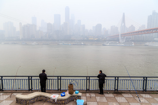 重庆的长江边上,人们在薄雾中钓鱼。视觉中国供图