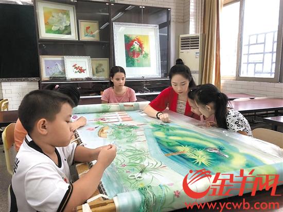 在广州市荔湾少年宫,一群10岁左右的学生和一位20来岁的女孩正围坐在一幅自然山水绣布前,女孩两手时而灵活地穿针引线,时而放下针线,摸摸孩子们的小脑袋,抓起孩子们的小胖手,细心细语地说:“平常我们都用‘直纹直针’绣,如果要绣水纹,就要用‘稀疏针’了,直的地方保持平衡,波浪的地方就要打斜一点点……”