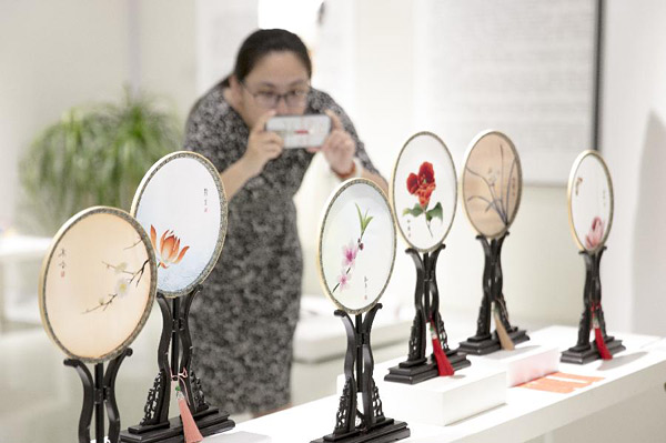 9月11日,观众在拍摄展出的团扇作品。当日,与时舒卷——中国非遗传承人群研培计划学员结业作品展在江南大学举办,展览共展出68位学员的纺织、紫砂、泥塑作品百余件。中国非物质文化遗产传承人群研培计划由文化和旅游部、教育部、人力资源和社会保障局三方共同牵头开展,旨在通过组织非遗传承人群的研修、研习、培训,提高中国传统工艺的设计、制作水平,促进传统工艺走进现代生活。