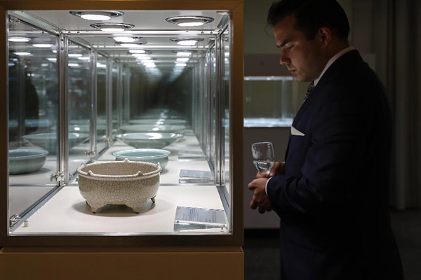 9月10日,在位于纽约的联合国总部,一名男子在2018龙泉青瓷巡展上观看展品。“人类非遗·中华经典”——2018龙泉青瓷巡展9月10日在纽约联合国总部亮相。此次巡展共展出81位龙泉青瓷匠人的85件青瓷珍品,其中包括为G20杭州峰会制作的双耳瓶等。