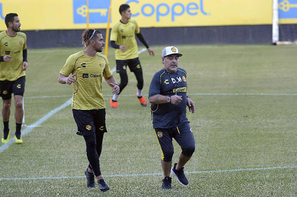 9月10日,马拉多纳(右)在发布会后带领球队训练。当日,阿根廷名宿迭戈·马拉多纳以主教练身份,出席执教墨西哥乙级联赛多拉多斯队后的首场新闻发布会。当天,他还参加球队训练,以备战15日对阵塔帕丘拉咖啡园队的首场比赛。