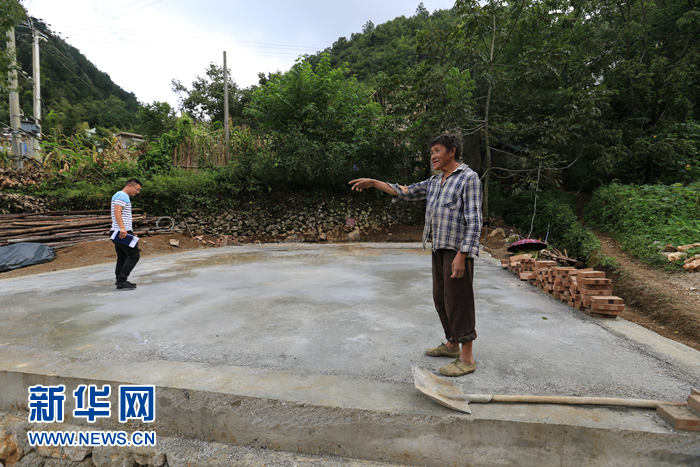 8月31日,旁如村村民王石金在自己正在建设的新房地基上与帮扶干部商量建房事宜。旁如村是贵州省安顺市紫云苗族布依族自治县的一个深度贫困村。新华网 黄勇 摄