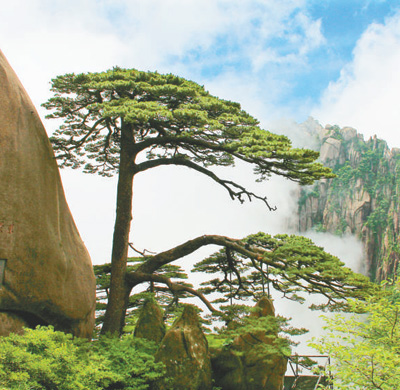 其中最有代表性的,当属那树龄千年的迎客松了。只见它立于玉屏峰峭壁的青狮石旁,隽秀飘逸,葳蕤挺拔。近前端详,迎客松虽饱经风霜,却枝干遒劲,郁郁苍苍,树冠如幡似盖,一方的侧枝横空斜出,好似展臂迎客一般。