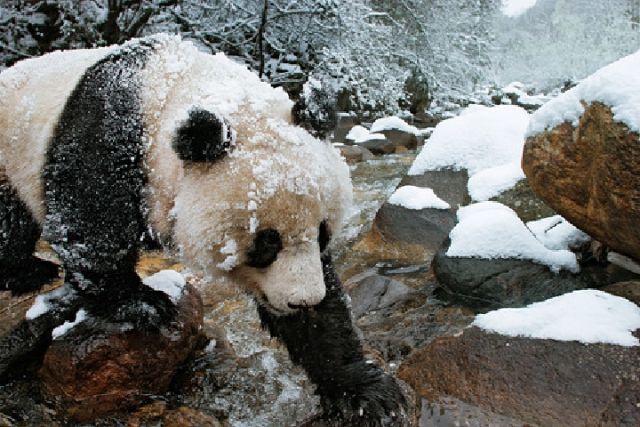 图为IBE摄影师向定乾拍摄的大熊猫。一个初春飞雪的清晨,陕西长青自然保护区内的一只大熊猫为了寻找伴侣,匆忙地蹚过酉水河。