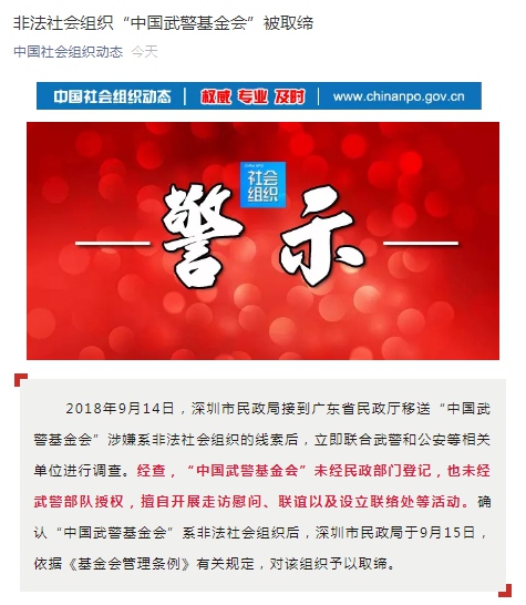 据民政部社会组织管理局微信公众号“中国社会组织动态”消息,在确认“中国武警基金会”系非法社会组织后,深圳民政局于9月15日依据《基金会管理条例》有关规定,对该组织予以取缔。