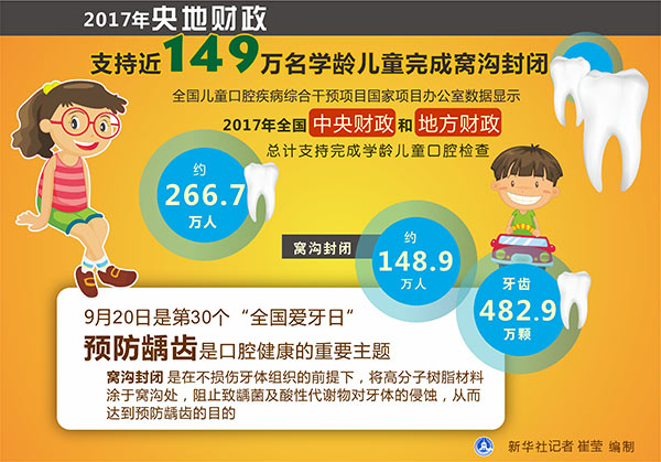 新华社北京9月18日电(记者陈聪)记者从全国儿童口腔疾病综合干预项目国家项目办公室了解到,2017年在中央和地方财政支持下,共有约149万名7-9岁儿童从窝沟封闭项目服务中获益,这些儿童龋齿发生得到了有效预防。
