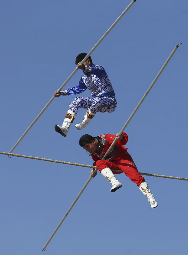 9月16日,艺人在新疆伊宁市七彩广场表演达瓦孜。达瓦孜意为“高空走索”,是维吾尔族民间传统杂技,艺人手持数米长的平衡杆,脚踩绷紧的绳索在高空或跑或走,或跳或躺,动作越险越难则显示艺人技艺越高。近日,在新疆第九届少数民族传统体育运动会上,一些在空中展示绝技的表演项目惊险刺激,吸引不少当地群众参观,尽显民间体育运动的魅力。