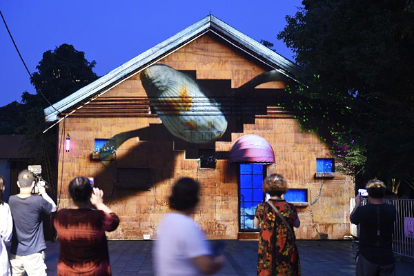 9月18日,人们在观赏墙面上投射的裸眼3D灯光秀。当日,第四届杭州灯光小品秀在浙江杭州拱墅区运河天地举行,绚丽多彩的灯光艺术作品吸引了众多观众。