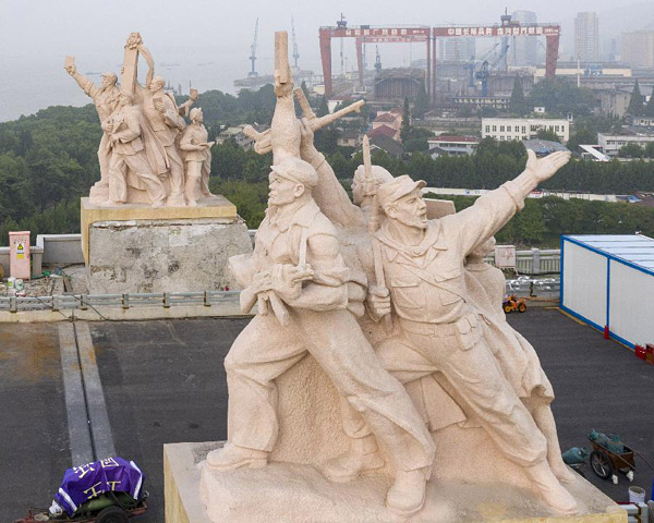 这是封闭维修中的南京长江大桥(9月18日无人机拍摄)。日前,正在进行维修改造工程的南京长江大桥公路桥桥面开始摊铺沥青,桥头堡及雕塑等处的围挡已拆除。南京长江大桥建成于1968年,公路桥于2016年10月28日开始封闭维修,预计2018年年底前完成维修改造,恢复通车。