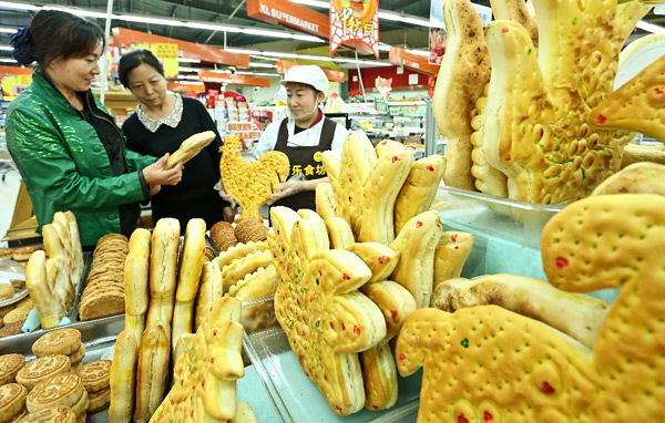 9月18日,在甘肃张掖一家超市,市民在选购“土月饼”。中秋节前制作“土月饼”是张掖的传统习俗,至今已有千年历史。“土月饼”用醒发后的面团做成各种造型,再经烤制而成,物美价廉,深受市民欢迎。