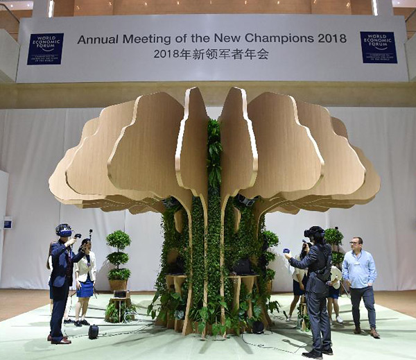 9月18日,在天津梅江会展中心,与会者体验“森林其境”项目。当日,第十二届夏季达沃斯论坛(2018年世界经济论坛新领军者年会)在天津举行,会场上虚拟现实技术体验、感知工业机器人、数字技术运用等科技感十足的展示项目吸引了众多与会者参观体验。