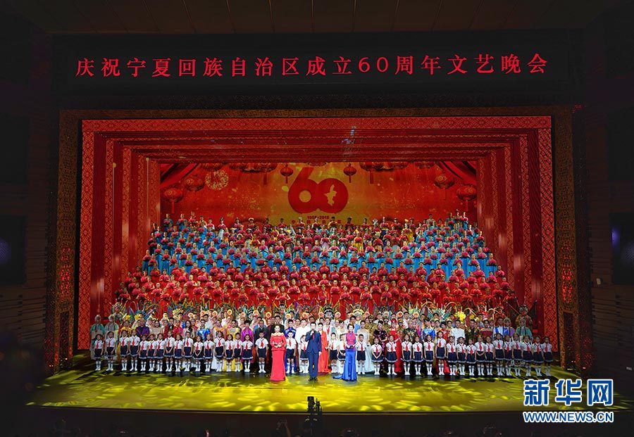 9月19日,庆祝宁夏回族自治区成立60周年文艺晚会《绽放新时代》在宁夏人民剧院上演。中共中央政治局常委、全国政协主席、中央代表团团长汪洋和各族各界干部群众等共约1400人观看演出。 新华社记者 邢广利 摄