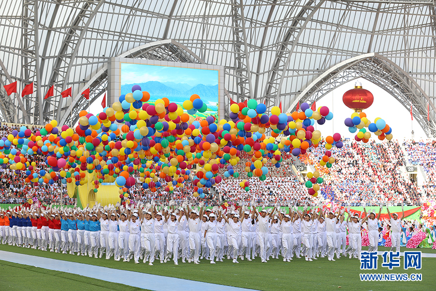 9月20日下午,宁夏回族自治区成立60周年庆祝大会在贺兰山体育场举行。图为仪仗方队上场。新华网 张洁龙 摄