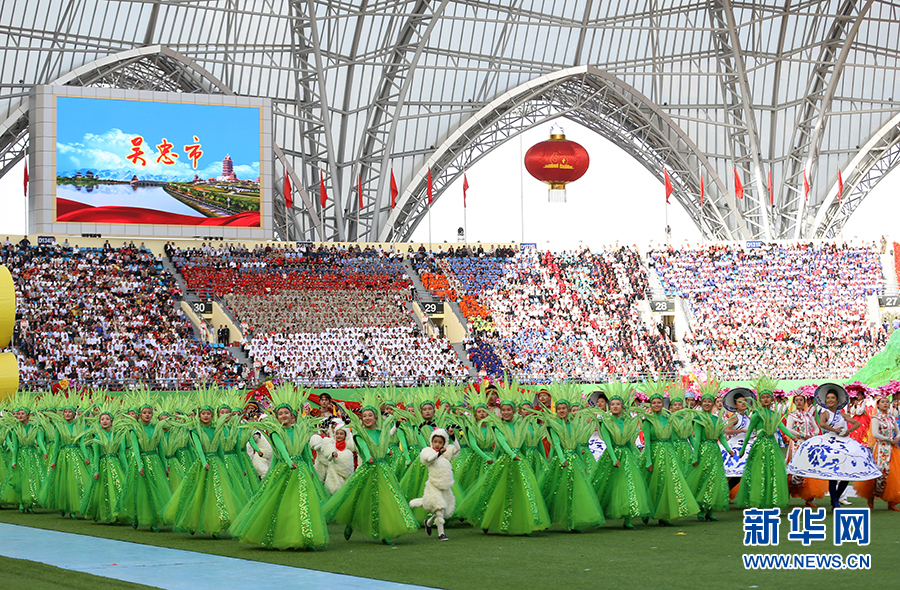 9月20日下午,宁夏回族自治区成立60周年庆祝大会在贺兰山体育场举行。图为吴忠市方队上场。新华网 张洁龙 摄