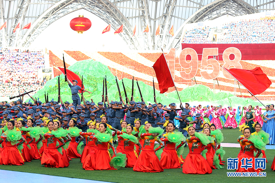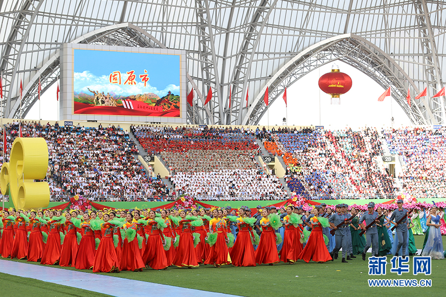 9月20日下午,宁夏回族自治区成立60周年庆祝大会在贺兰山体育场举行。图为固原市方队上场。新华网 张洁龙 摄