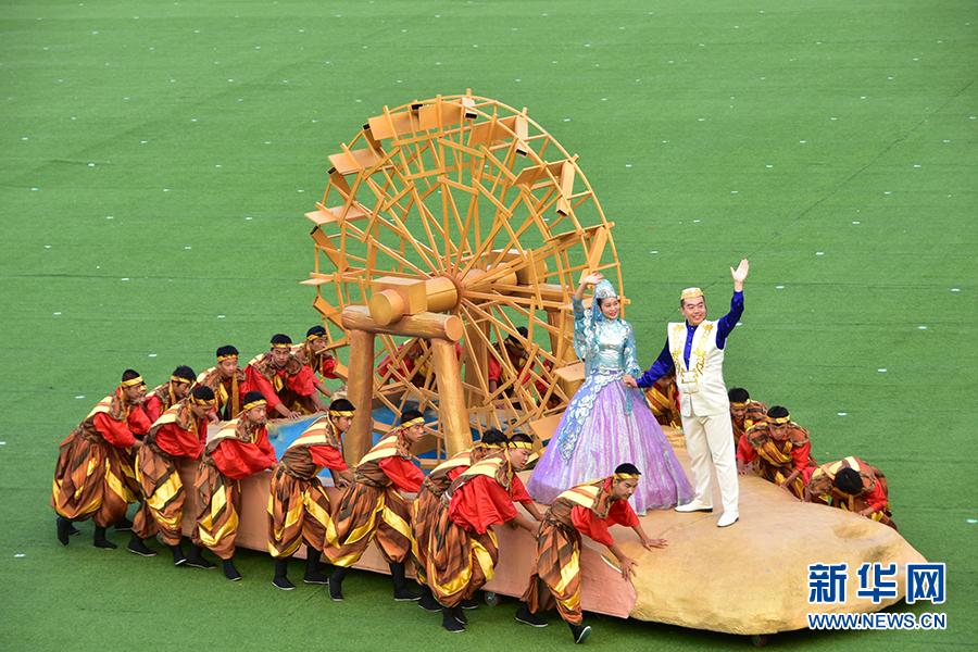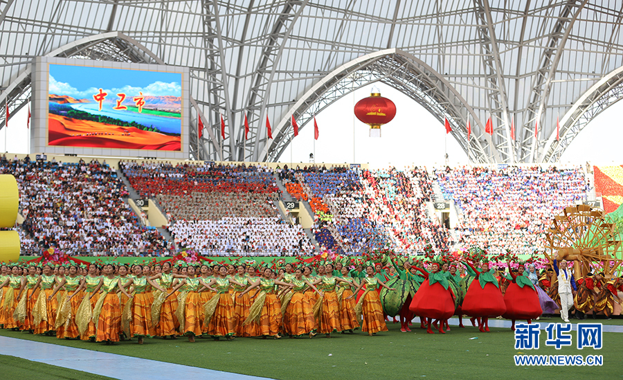 9月20日下午,宁夏回族自治区成立60周年庆祝大会在贺兰山体育场举行。图为中卫市方队上场。新华网 于晶 摄