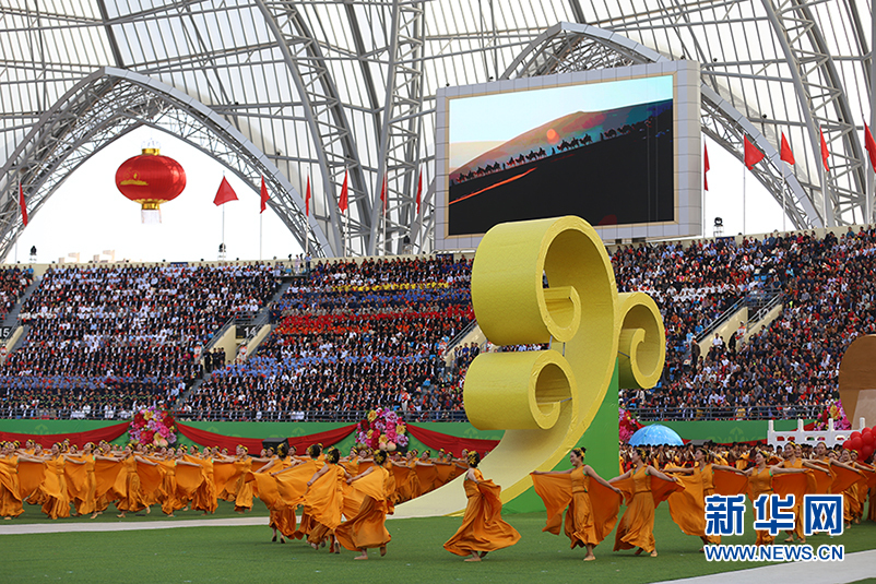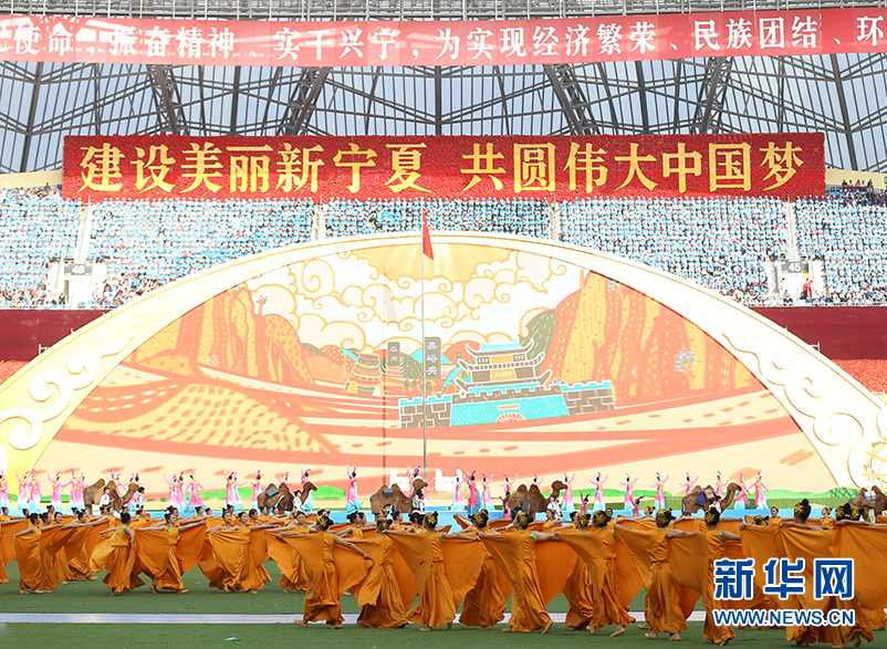 9月20日下午,宁夏回族自治区成立60周年庆祝大会在贺兰山体育场举行。图为《丝路欢歌·开放发展》主题表演。新华网 张洁龙 摄