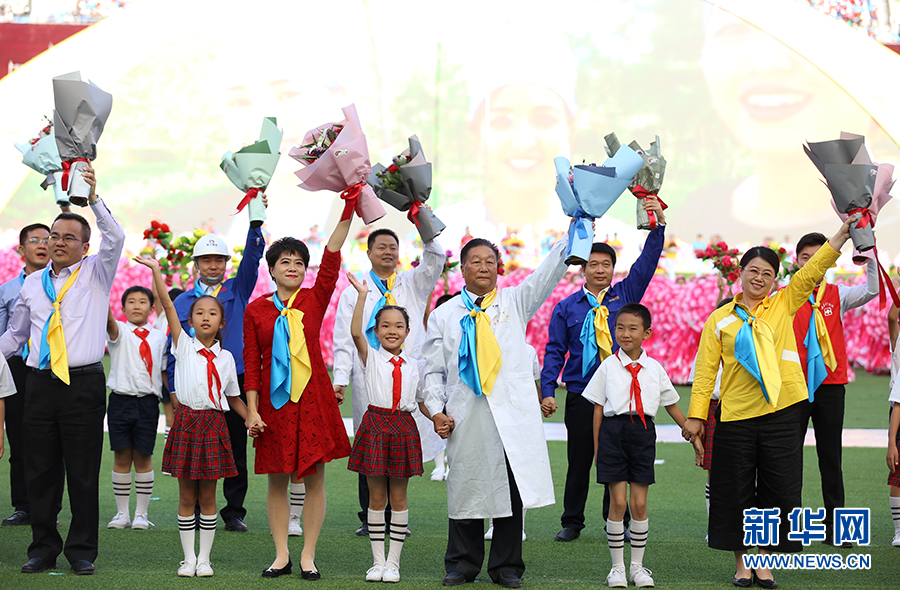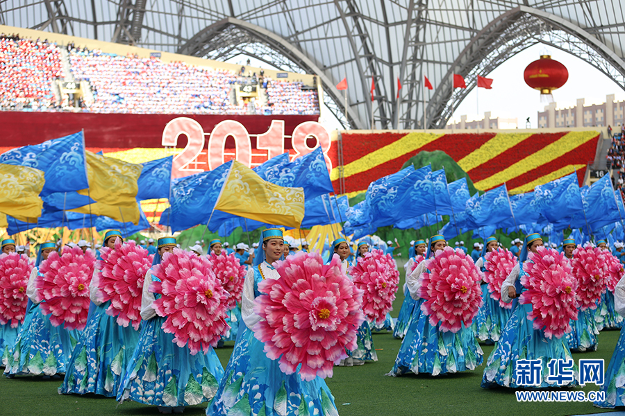 9月20日下午,宁夏回族自治区成立60周年庆祝大会在贺兰山体育场举行。图为《闽宁协作·八方支援》主题表演。新华网 张洁龙 摄