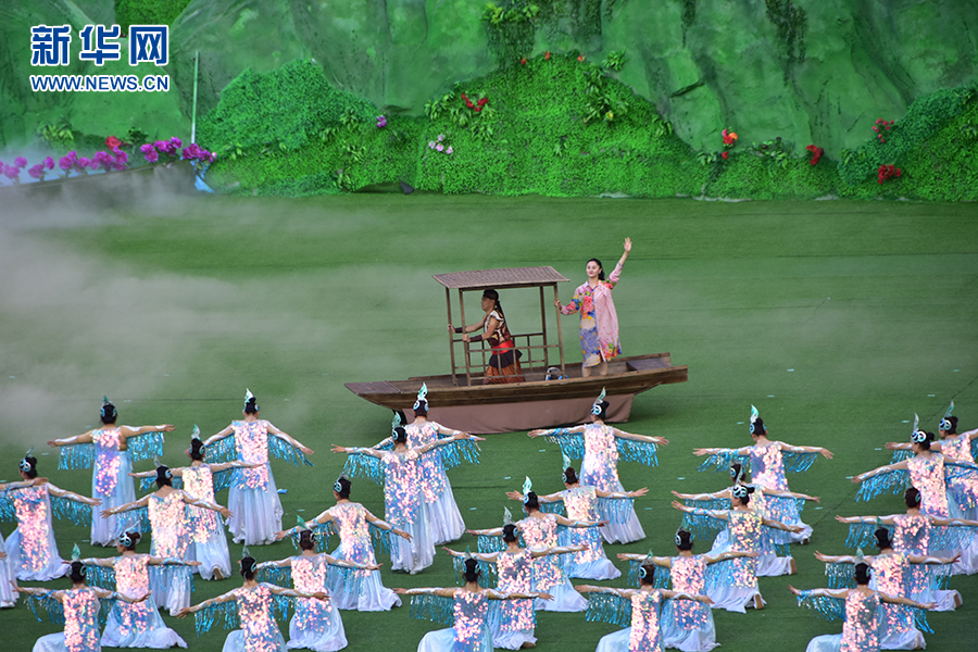 9月20日下午,宁夏回族自治区成立60周年庆祝大会在贺兰山体育场举行。图为《塞上江南·美丽宁夏》主题表演。新华网 于晶 摄