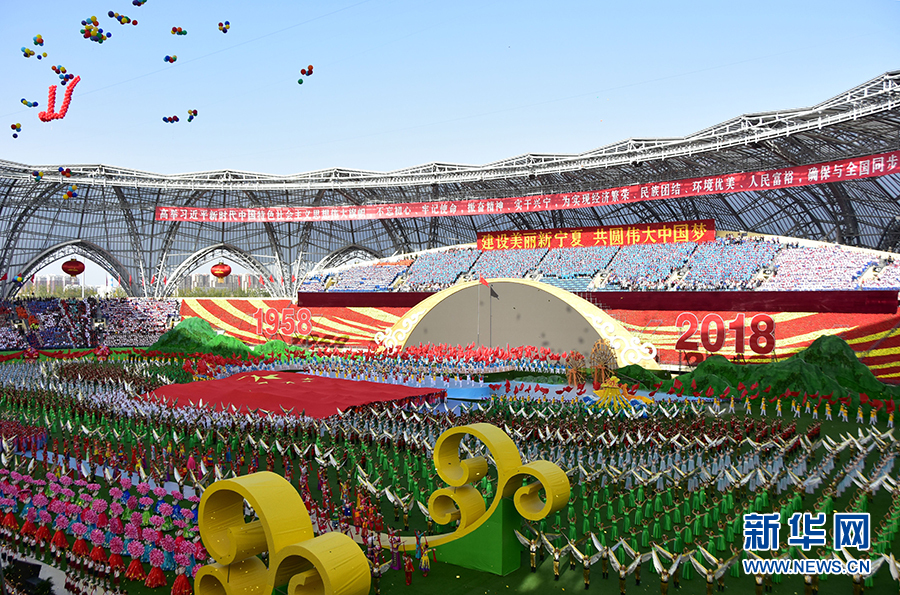 9月20日下午,宁夏回族自治区成立60周年庆祝大会在贺兰山体育场举行。图为尾声表演《歌唱祖国》。新华网 于晶 摄