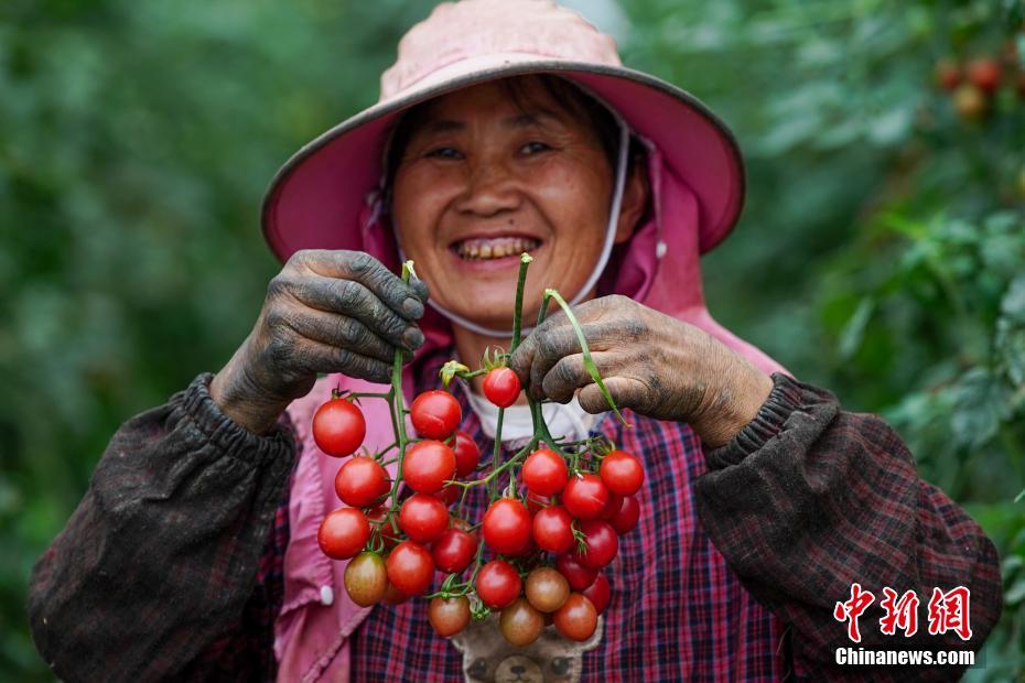 9月21日,贵州大方对江镇,一名果农展示成熟的圣女果,喜笑颜开。贵州省大方县对江镇安兴村976个圣女果种植大棚迎来采摘季,果农在果园内采摘、分拣圣女果,供市场所需,一派繁忙景象。中新社记者 贺俊怡 摄