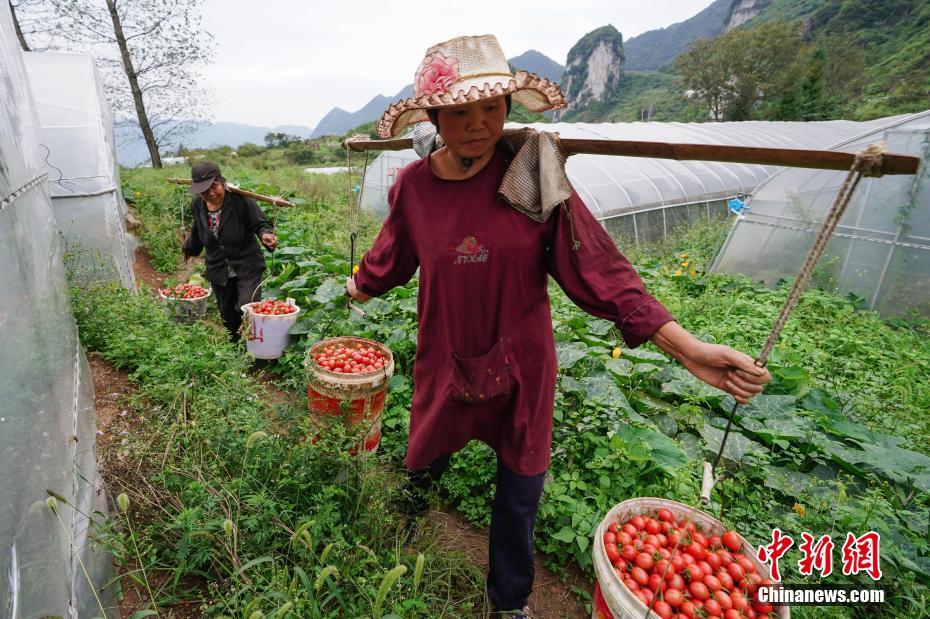 9月21日,贵州大方对江镇,果农挑着圣女果从大棚旁经过。贵州省大方县对江镇安兴村976个圣女果种植大棚迎来采摘季,果农在果园内采摘、分拣圣女果,供市场所需,一派繁忙景象。中新社记者 贺俊怡 摄