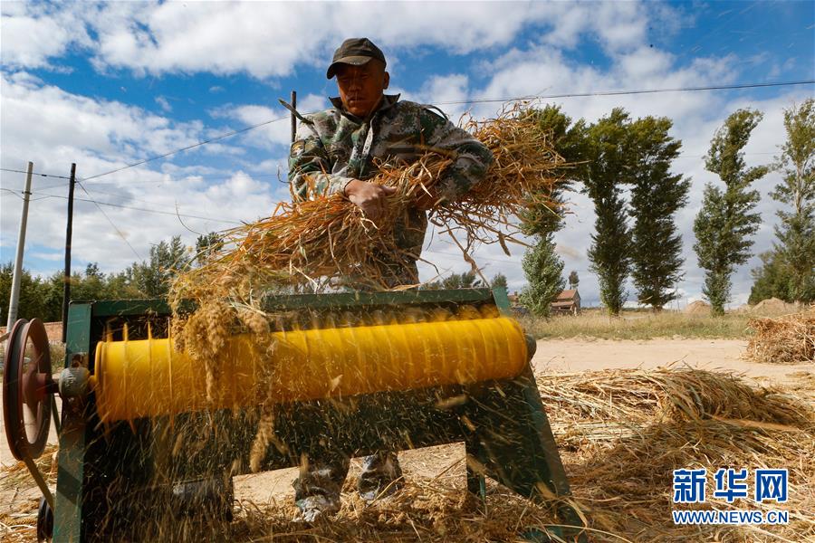 9月22日,敖汉旗北三家村村民给谷子脱粒。 新华社记者 虞东升 摄