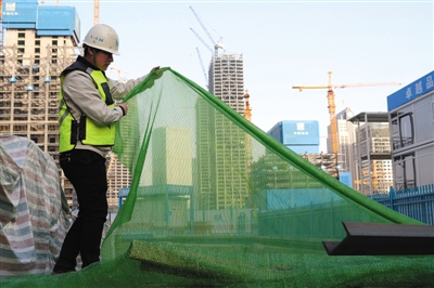 今年2月,中国铁物大厦项目工地配备网眼更细密的防尘网,有助更好控制扬尘污染。资料图片/新京报记者 吴江 摄