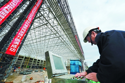 “机库大厅平面长147米、宽99.7米,网架总重约1600吨,是此次整体提升的重点所在。”北京建工三建公司项目负责人介绍,针对工程的技术难度和跨度,项目团队采用了“地面拼装+整体提升”的方法完成钢屋盖网架提升,先用吊车将各个拼装单元在机库地面上对应的投影位置进行组装,随后利用提升支架将完成拼装的屋架整体提升。9月25日,工程首先启动历时1小时左右的预提升,将大厅网架提升至0.4米。1天后,正式启动整体提升,提升高度22米,平均提升速度达2-3米/小时。截止到今天上午,钢屋盖全部提升到位,代表着东航基地机库完成封顶。