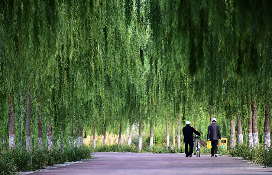 2017年9月25日傍晚,两位老人在甘肃省高台县黑河城市湿地公园里散步。三北工程大大改善了当地人居环境。章轲 摄