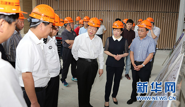 浙江省湖州市委副书记、市长钱三雄(前右三)检查位于德清县的首届联合国世界地理信息大会项目建设(2018年6月10日摄)。新华社发