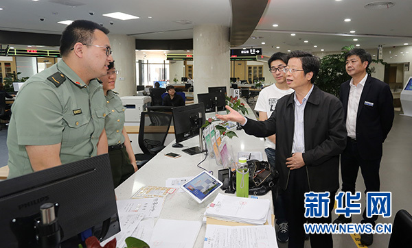 浙江省湖州市委副书记、市长钱三雄(右二)在湖州市民服务中心调研指导“最多跑一次”改革工作(2017年5月10日摄)。新华社发