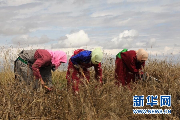 海南藏族自治州共和县塘格木镇吾赫勒村村民在收割青稞(9月26日摄)。 时下正值青海省海南藏族自治州青稞收获季,当地农民抢抓农时进行收割,田间一派繁忙景象。 新华社记者 赵玉和 摄
