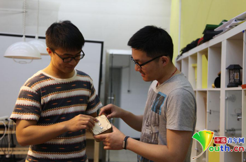 清华大学创客空间协会成员张承巍(左)与毕滢(右)正在介绍他们的创意成果“音乐盒子”。资料图