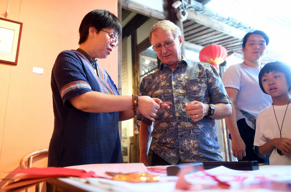 10月3日,在福建福州三坊七巷举行的非遗剪纸展上,福州杨桥中学英语老师潘力鹰(左)在向美国客人讲解中国的民间剪纸艺术。当日是国庆假期的第三天。新华社记者 林善传摄