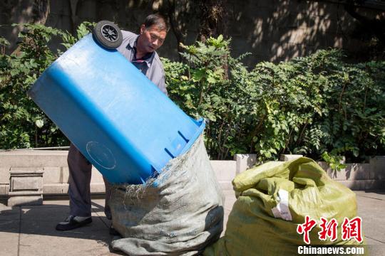 徐道海将垃圾桶筒内的垃圾装入袋子。梅宁 摄