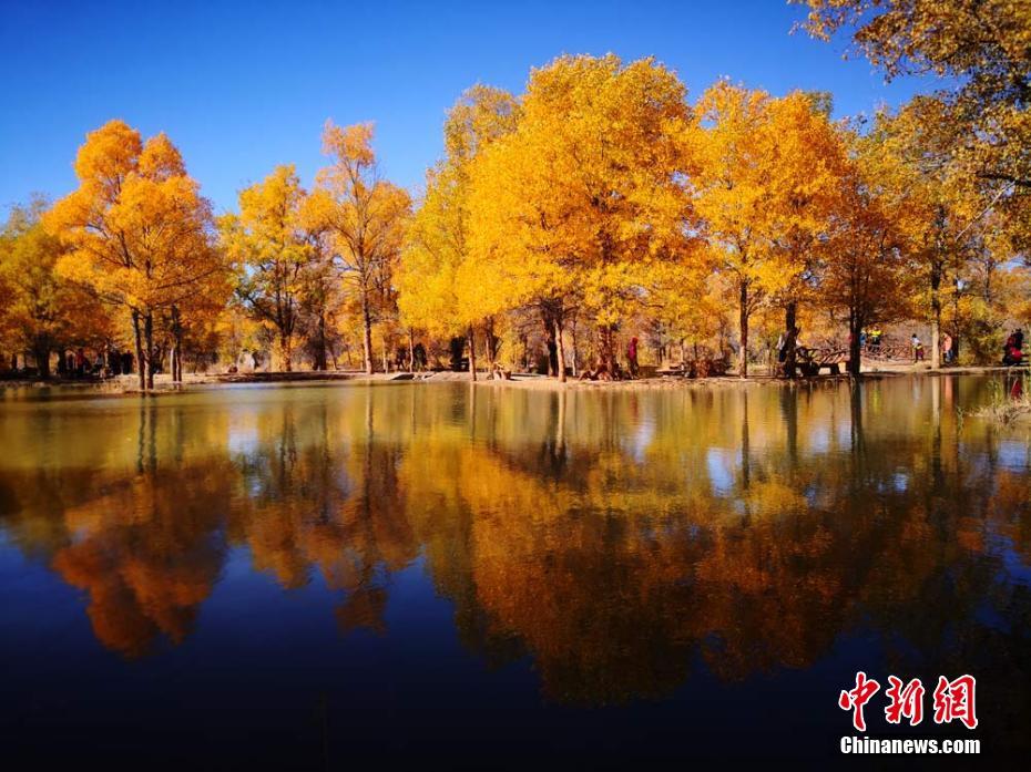 进入十月以来,位于甘肃省酒泉市金塔县的胡杨林处处景色宜人,层林尽染,金色的胡杨在湖水的映衬下更加迷人,引来不少游客在这里观光游览。高宏善 摄