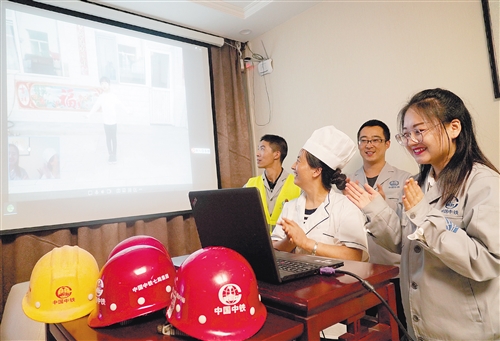 10月4日,正在建设中的北京地铁19号线牡丹园车站,中铁七局职工通过视频投影设备和亲人连线交流。国庆假期,许多建设者坚守岗位无法与家人团聚,项目部为他们开通亲情连线,利用微信、在线视频等多种通讯工具让他们和远在外地的亲人视频通话。经济日报记者 赵 晶摄