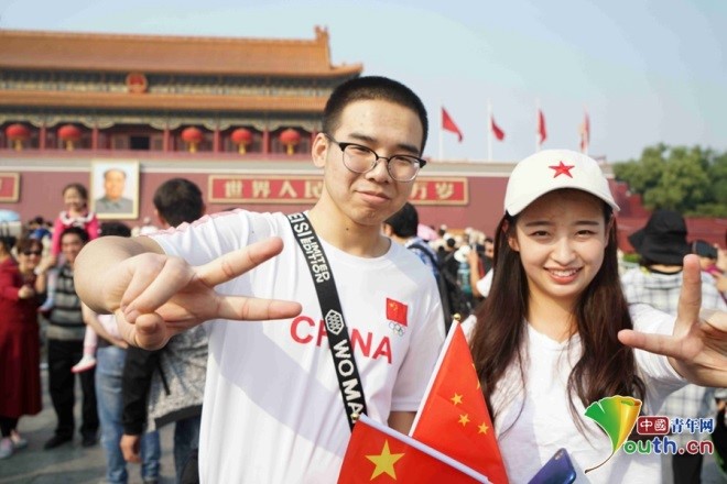 来自邢台医学高等学校护理专业的同学二人,他们都是河北人,将在北京民航总医院实习一年。男护士爱说rap,女护士笑着说他总喜欢别人叫他二狗。国庆期间,他俩特地穿戴了印有“China”、中国国旗和五星标志的文化衫和帽子,来到了天安门。他们祝愿祖国越来越繁荣昌盛。中国青年网记者 秦亮 摄