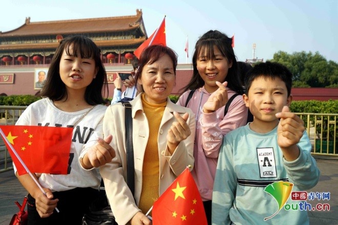 来自山东聊城的一家人,妈妈带着三个可爱的儿女比心祖国。姐弟三人的愿望是愿爸爸妈妈身体健康,万事如意,而妈妈最大的心愿是孩子们能好好学习,报效祖国!中国青年网记者 秦亮 摄
