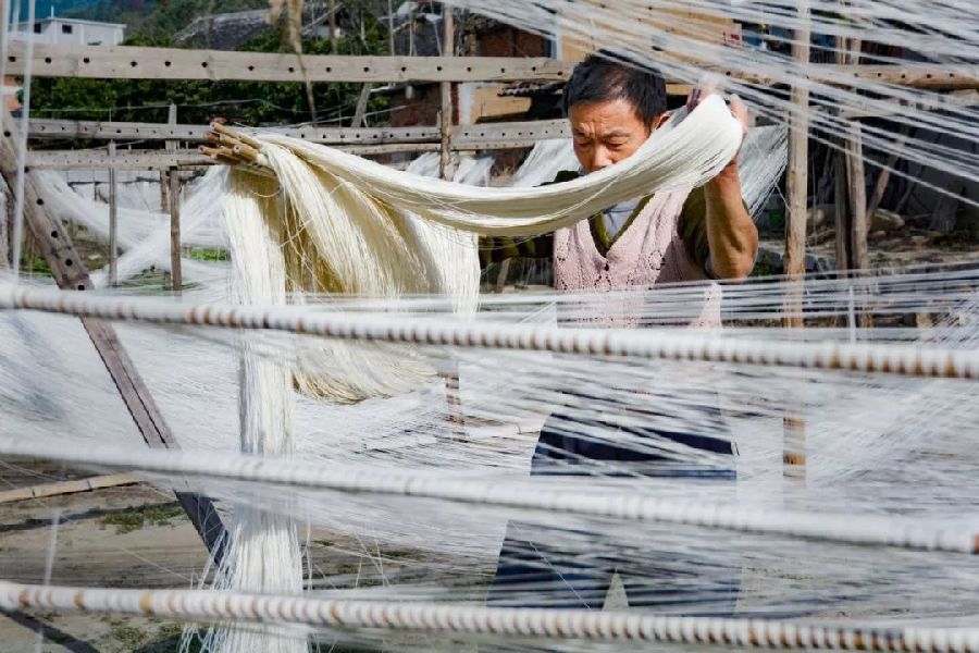 2018-10-01,福建福州。宋代诗人黄庭坚《过土山寨诗》中“汤饼一杯银丝乱,牵丝如缕玉簪横”,说的就是线面。作者:郭先生