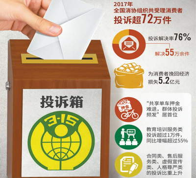 中消协《2017年全国消协组织受理投诉情况分析》显示,从投诉性质来看,去年全国受理投诉中合同问题、售后服务和产品质量问题占投诉总量八成以上。