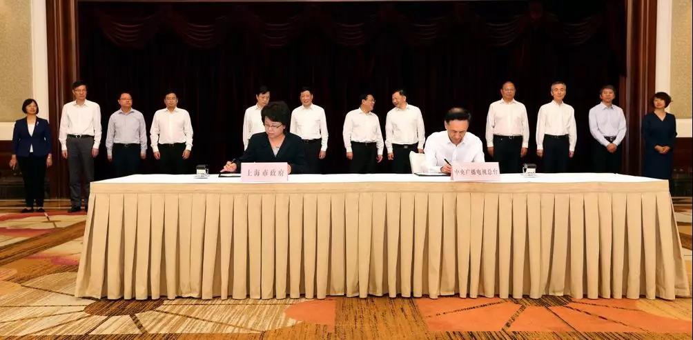 中央广播电视总台副台长阎晓明和上海市副市长翁铁慧分别代表双方签订战略合作框架协议。中国国际电视总公司负责人与上海市徐汇区政府负责人签署了项目合作协议。