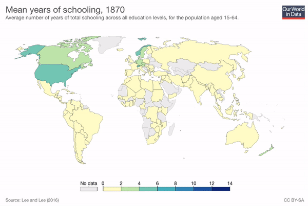 下图为19世纪以来的人均受教育年数(深蓝色代表12年以上)。200年前,能读写的人就是社会精英了,只占人口中的极少数。但是现在世界上能读写的人数占80%。