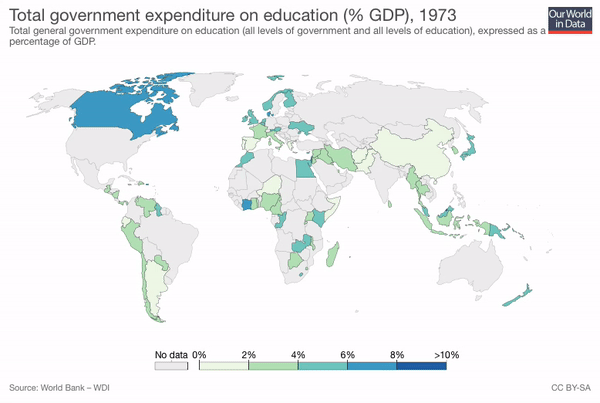 1973-2016年,各国政府的教育支出占 GDP 的比值(深蓝色代表教育支出占比大)。