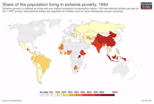 1981-2014年,各国赤贫人数的百分比(红色表示赤贫人口比例更大)。1950年,世界75%的人口生活在赤贫线上,但是现在,全世界的赤贫人口只占10%不到。